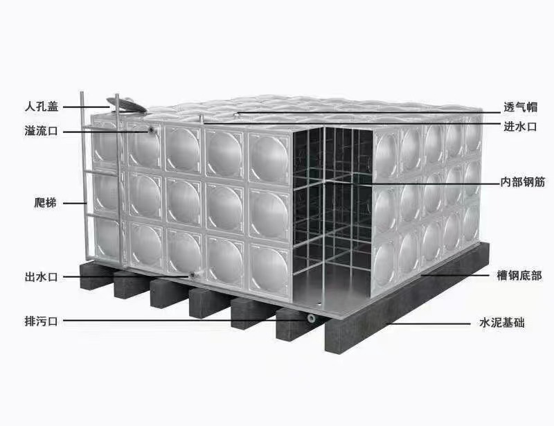 1、水箱框架:这是不锈钢水箱的基础结构,通常由不锈钢板焊接而成。框架的外形尺寸和重量均按照设计图纸的要求加工。它不仅为水箱提供了坚固的支撑,还确保了水箱的整体稳定性。